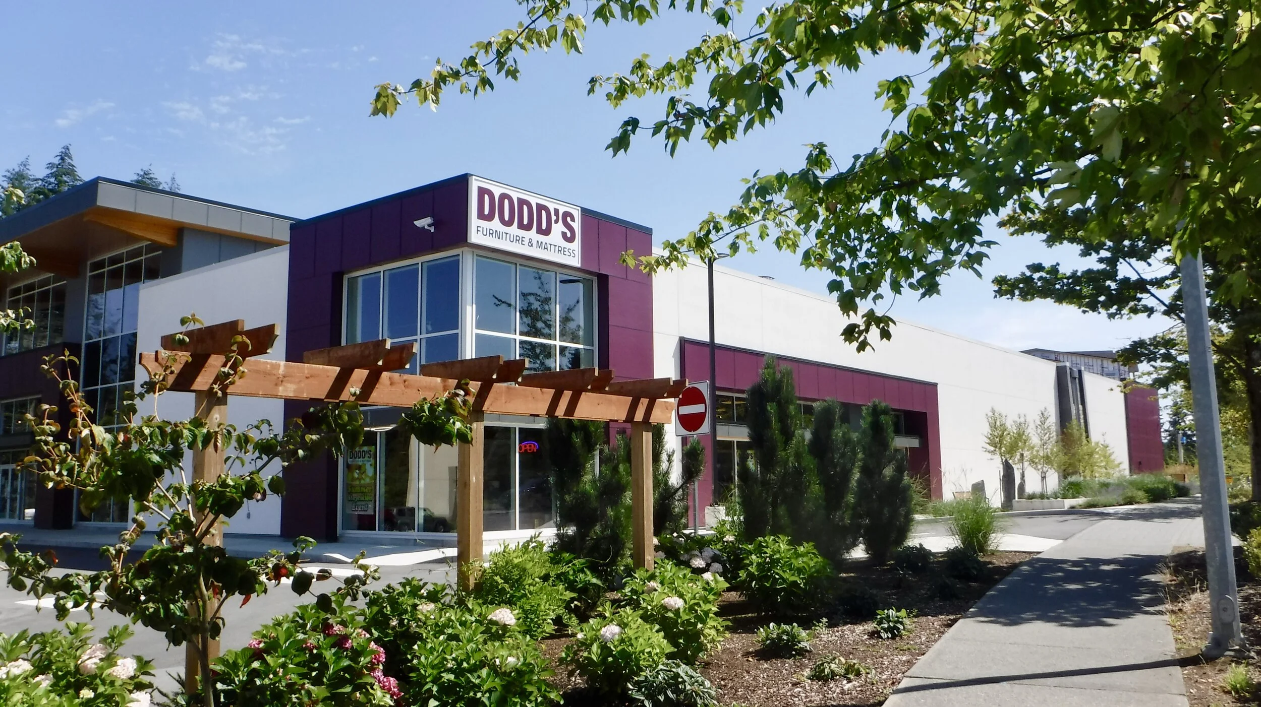 Dodd’s Furniture & Mattress was designed in tandem with the La-Z-boy Furniture Gallery building that shares the corner of Turner and Uplands Drive, in Nanaimo. The concept for the site was to rethink how a furniture outlet can engage with community and design objectives. The site design primarily focuses on water retention initiatives: through an application of a completely green roof at the highest roof level and water retention with slow release at the lower level roof, the progress of stormwater run-off is delayed before it passes through a series of architecturally designed waterfall features, water channels and bio swales, before rejoining the system. The site is heavily vegetated providing a soft backdrop to the two furniture stores. By introducing an inner road to the site, the buildings were able to have a more transparent massing and a pedestrian corridor was created through the development. These design elements also allowed us to create display windows at these important nodes of entry.
