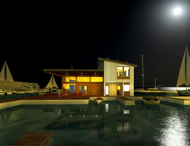 Extensive glazing and large overhangs engage with the wharf side providing a welcoming entrance and allowing gatherings to spill out onto the wharf.