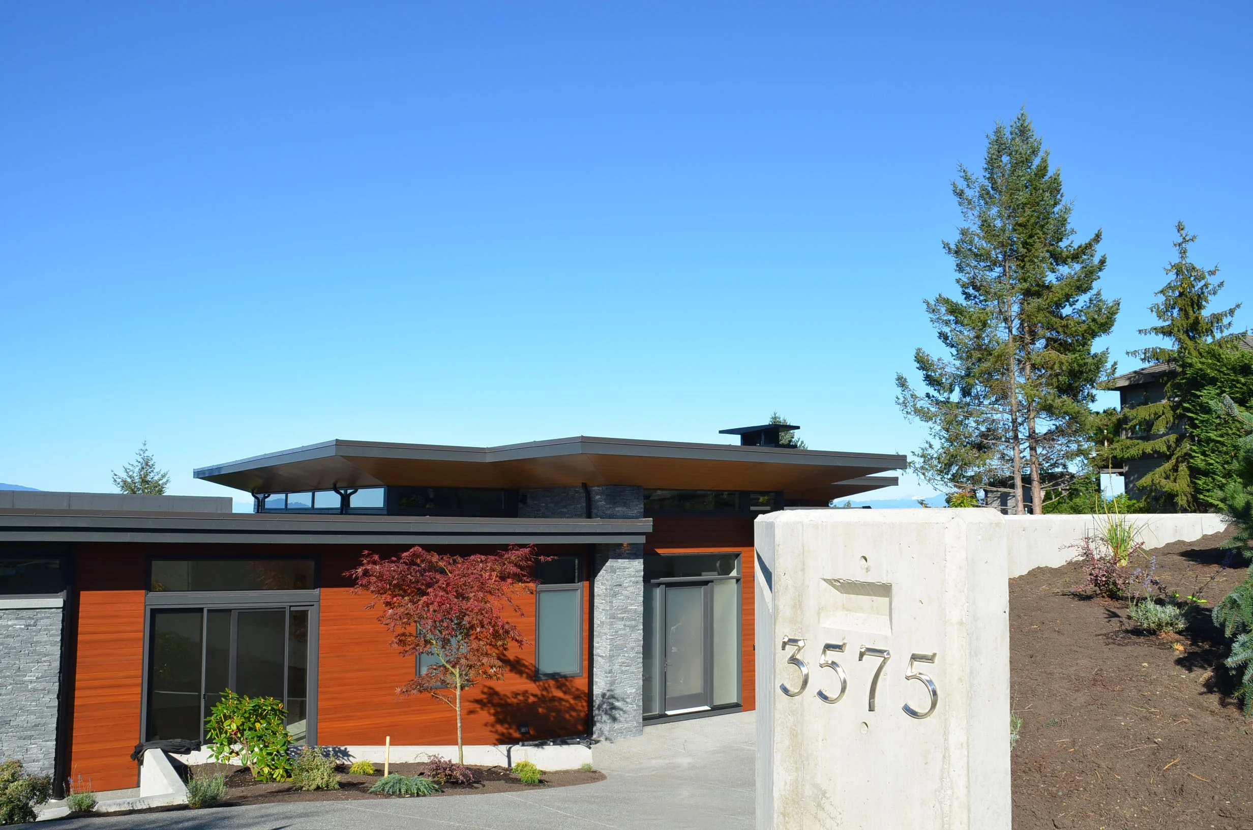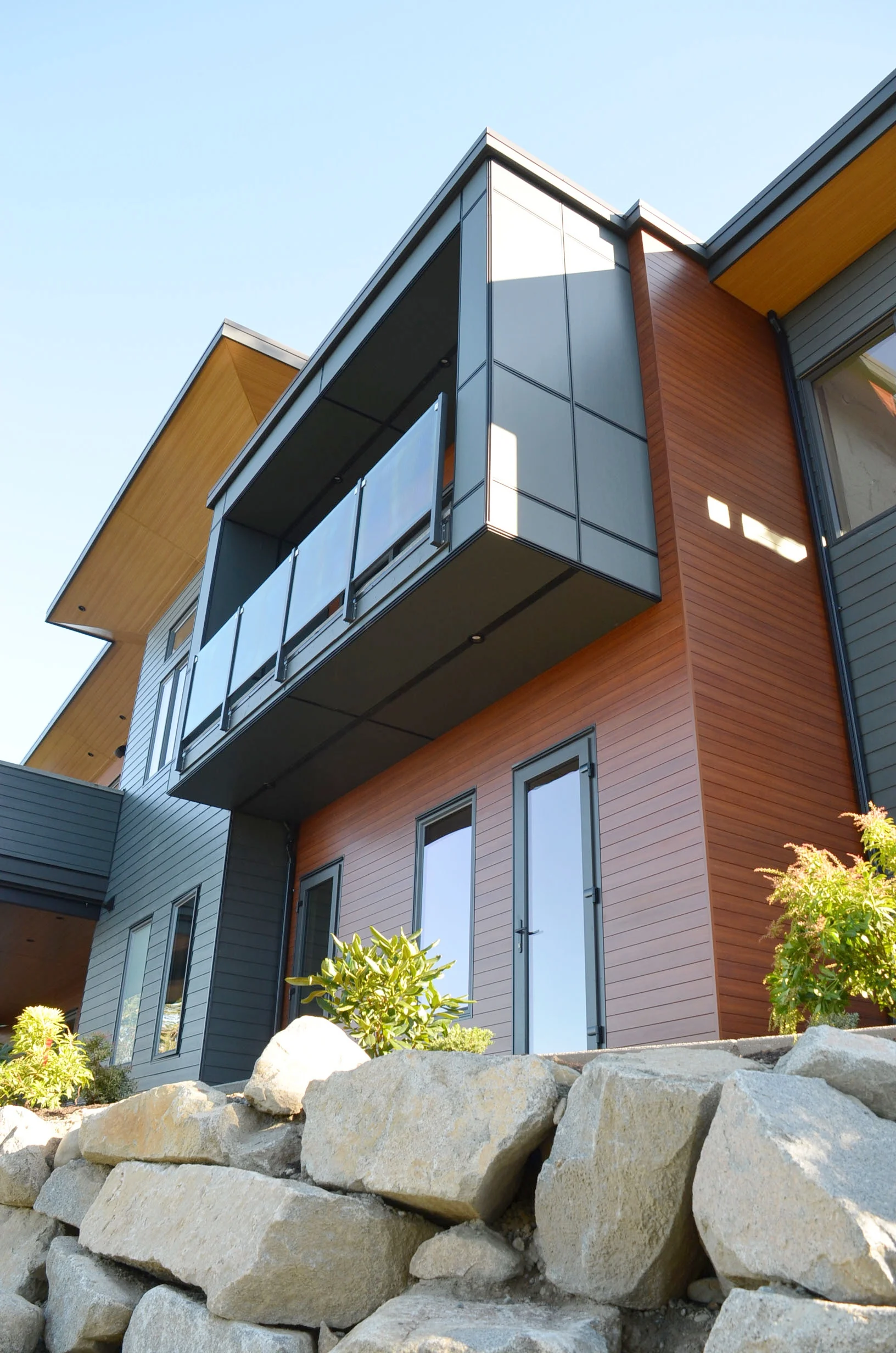 The home is a complex play of material textures ranging from local basalt stone, stamped concrete, pine soffit and longboard siding in dark cherry, to the soft play of light as it is carried down into the living spaces through translucent and transparent glass to play across the walls and surfaces within.